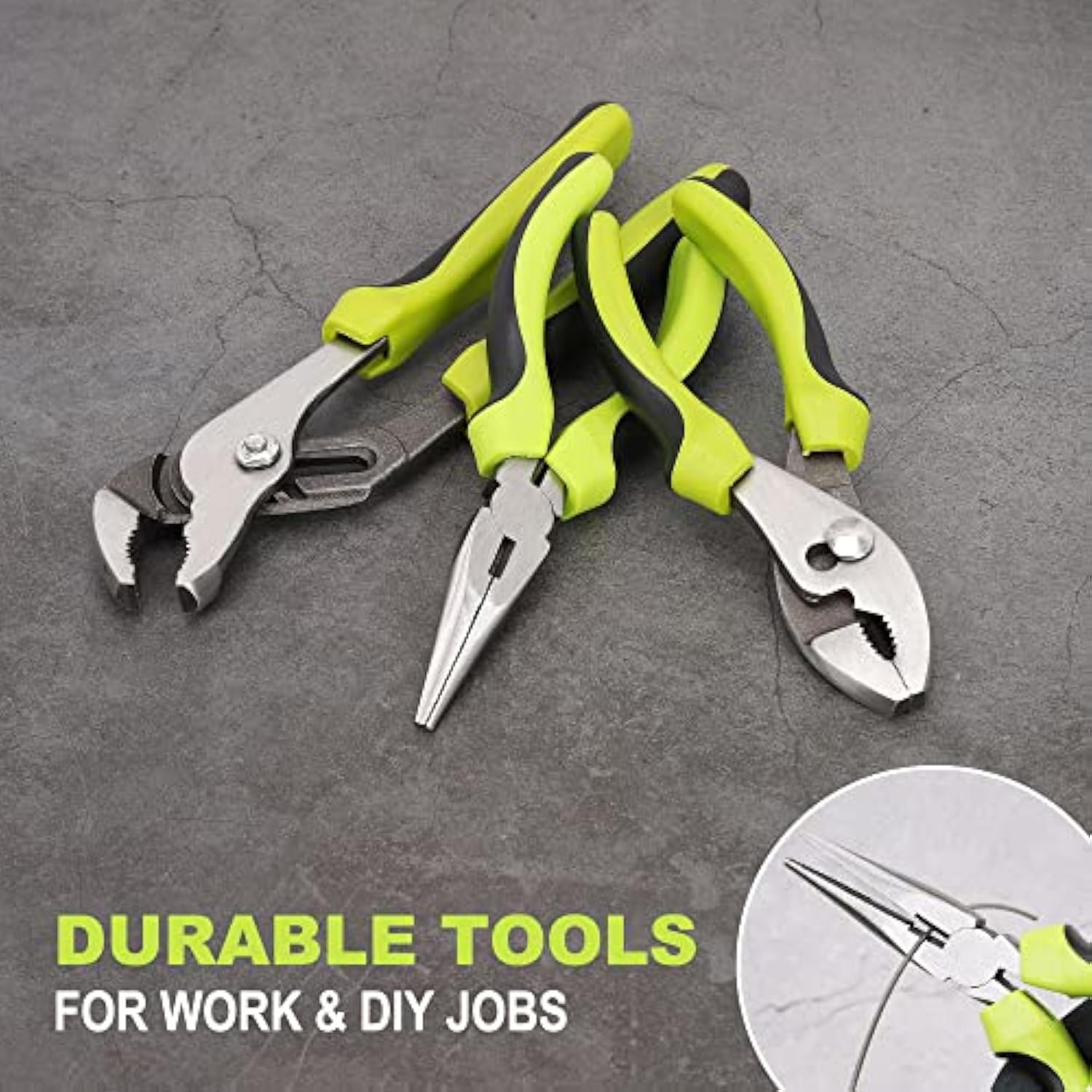 Includes slip joint pliers, groove joint pliers, adjustable wrench, long nose pliers, magnetic screwdriver holder, screwdriver bits, tape measure.